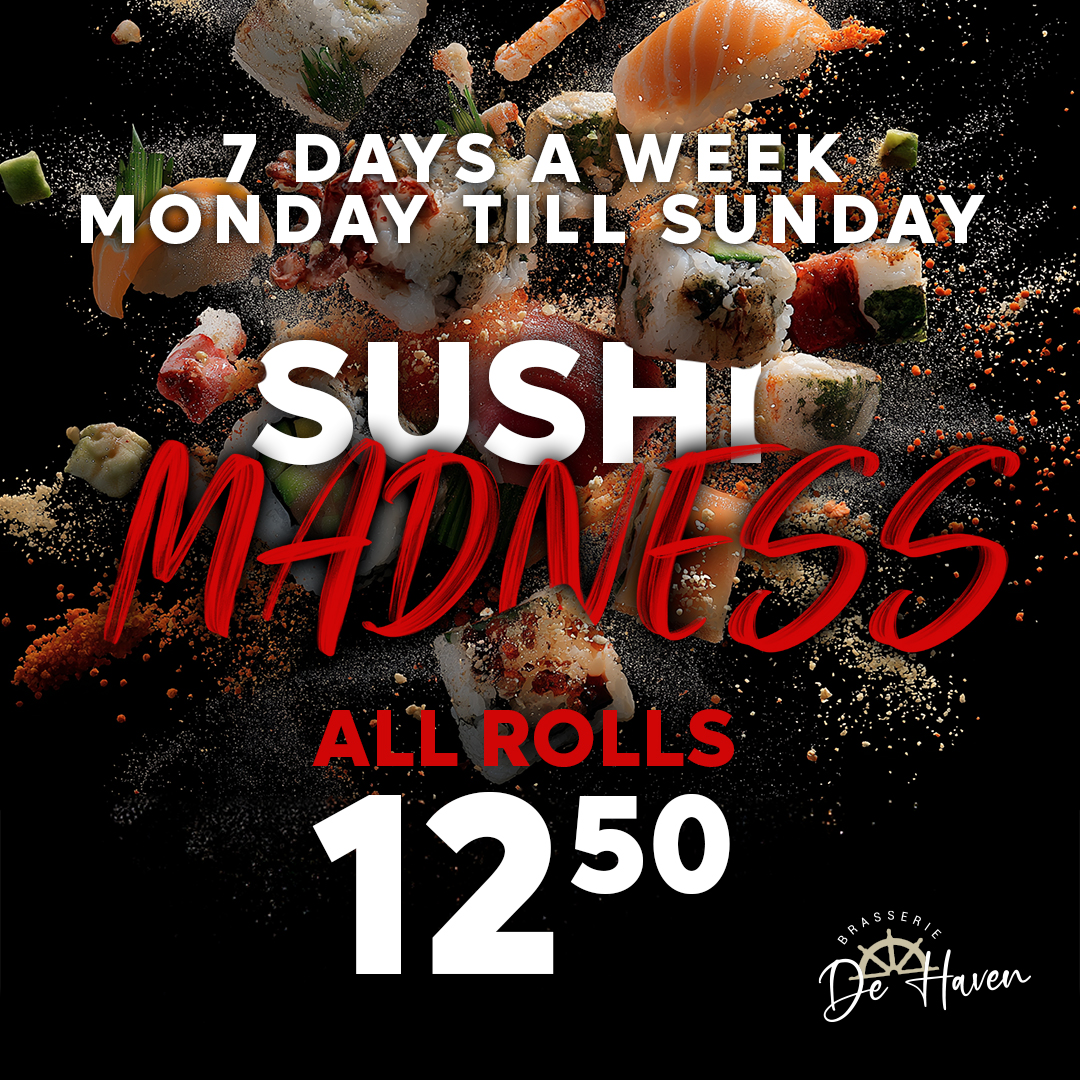 Sushi Madness! 7 dagen per week van maandag tot zondag! All rolls 12,50 Take away all rolls 10,00